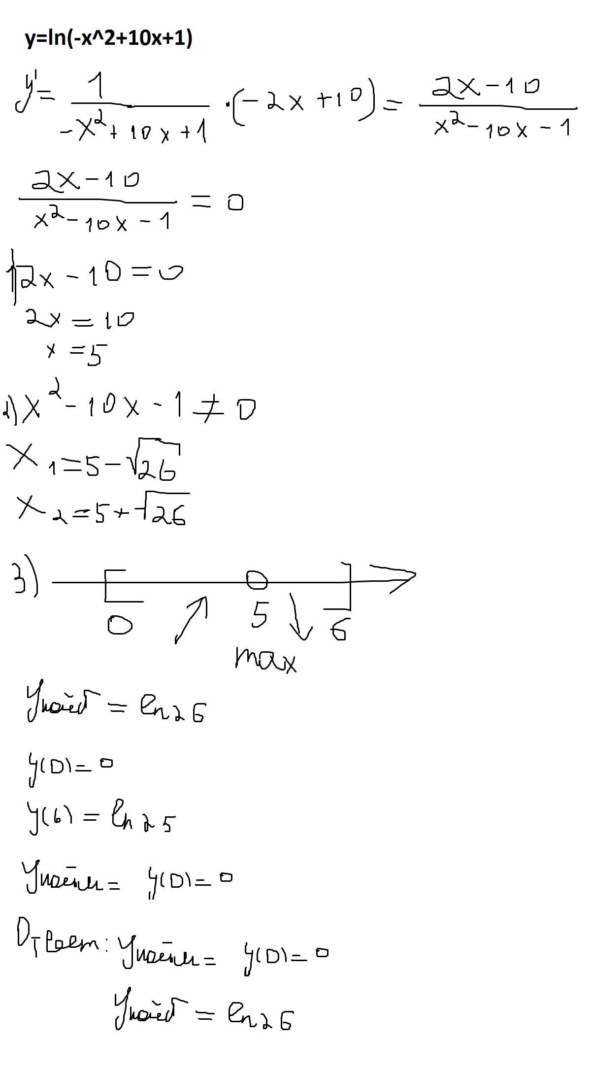 Найти наибольшее и наименьшее значение функции y=ln(-x^2+10x+1) на отрезке [0;6]