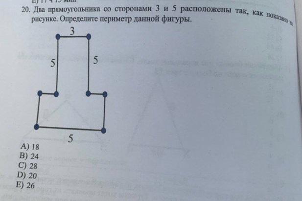 Стороны все разные, поэтому нужно просто добавить все стороны.периметр 1 прямоугольника - (5+3)•2=16 и второго так же. 16+16=32. Так как оба прямоугольника неполные(в каждом отсутствует по 3см). Тоесть 5•2+3=13(периметр каждого прямоугольника). Получается 13+13=26