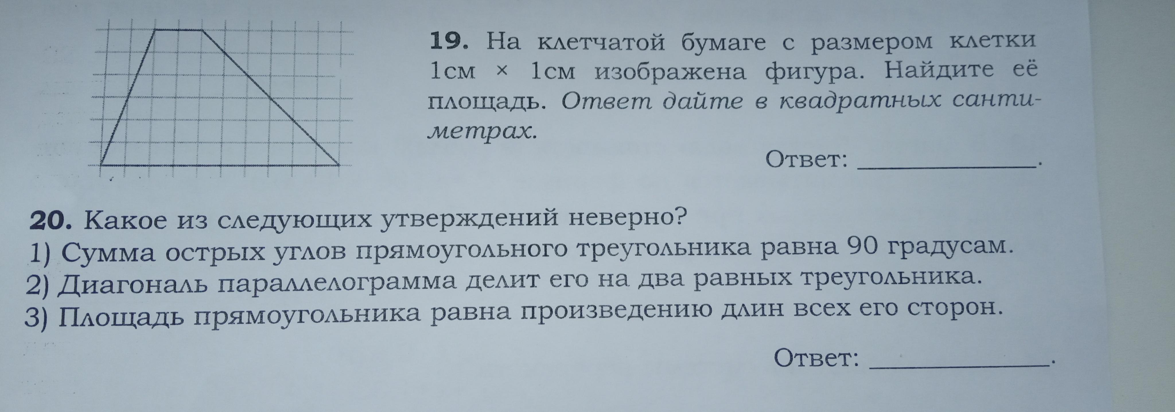 2 задача. Утверждение 3 неверно. Площадь треугольника равна половине произведения длины основания и высоты. Или по формуле Герона S=√(p(p-a)(p-b)(p-c), где р - полупериметр, а, b и с - стороны треугольника.