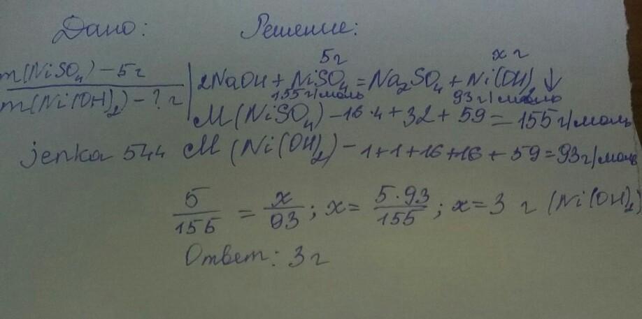 Рассчитать массу образовавшегося осадка в результате взаимодействия гидроксида натрия и 5 г сульфата никеля.