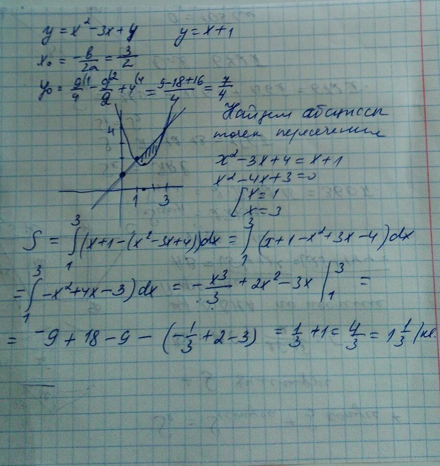 вычислить площадь фигуры ограниченной линиями y=x2-3x+4, y=x+1