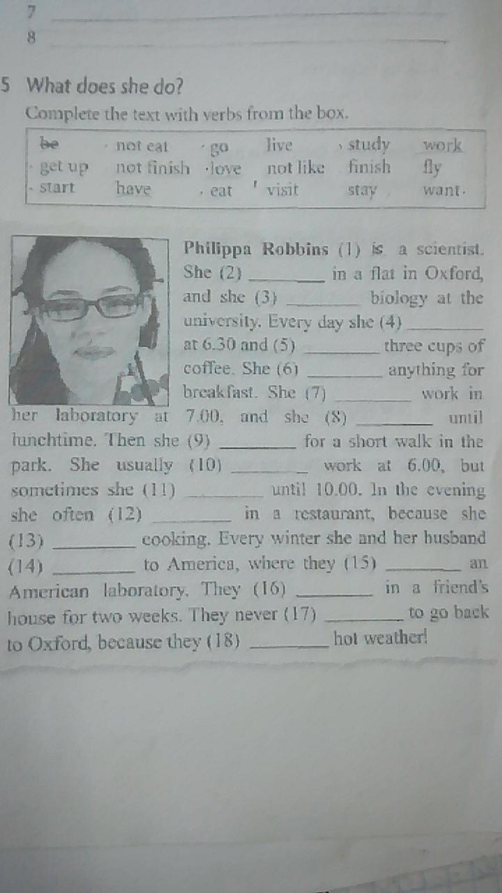 2 lives 3 studies 4 gets up 5 has 6 doesn't 7 starts work 8 works 9 goes 10 finishes 11 doesn't finish 12 eats 13 doesn't like 14 fly 15 visit 16 stay 17 want 18 love