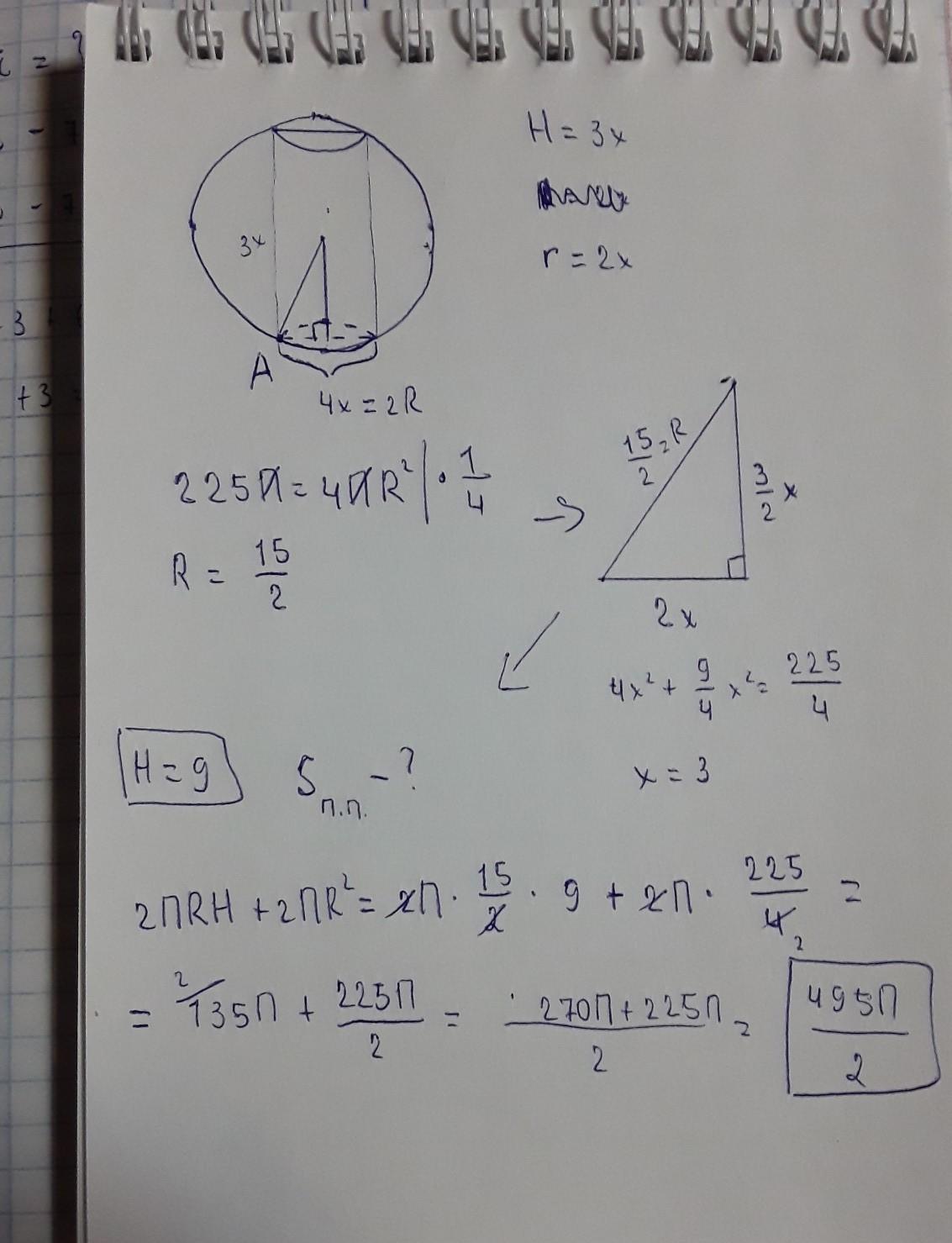 в шар вписан цилиндр. Радиус основания цилиндра относится к его высоте, как 2:3. Площадь поверхности шара равна 225п. Вычислите площадь полной поверхности цилиндра