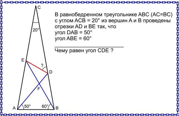 В равнобедренном треугольнике ABC (AC=BC) с углом ACB = 20° из проведены отрезки AD и BE так, что