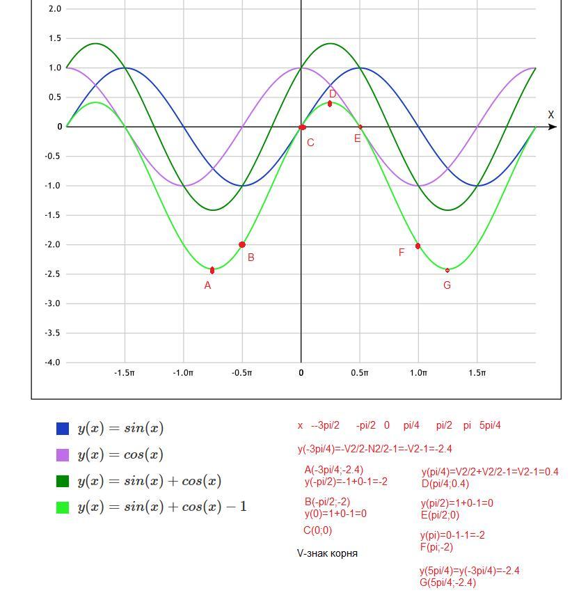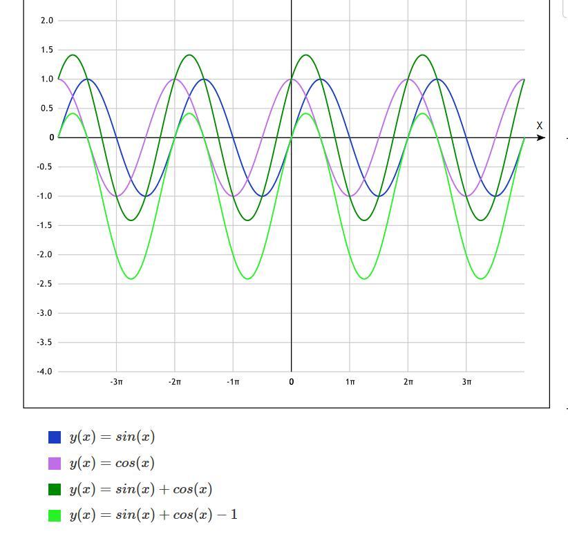 сначала берешь график sinx. потом складываешь его с графиком cosx, и полученную сумму опускаешь по оси у на 1 вниз....