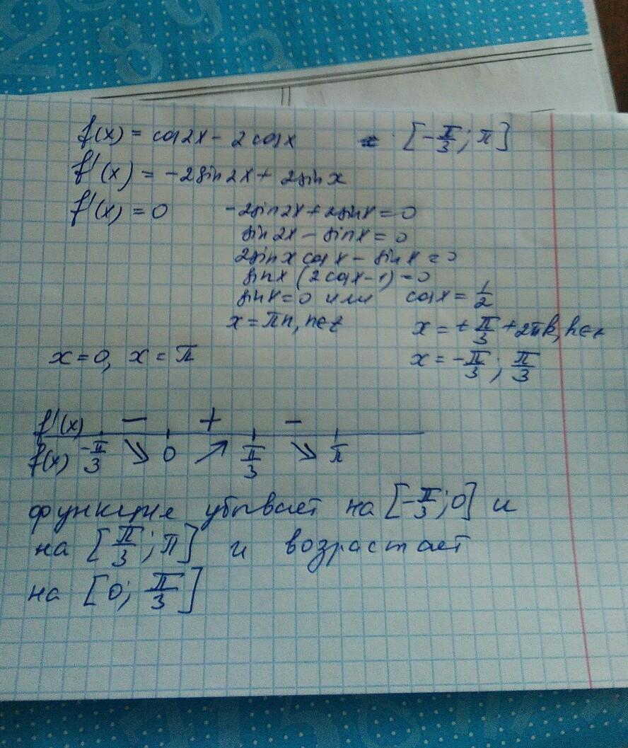 Исследуйте функцию f(x)= cos2x-2cosx на возрастание и убывание на промежутке [-пи/3;пи]