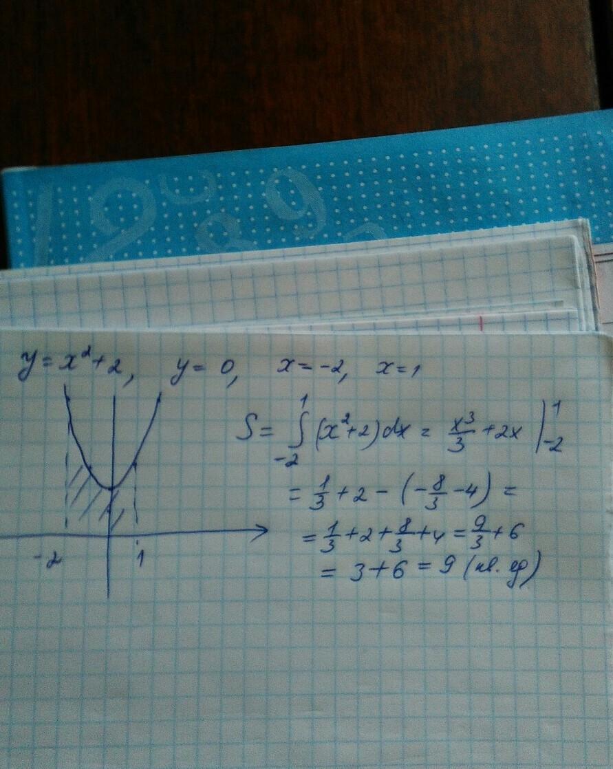Площадь фигуры равна определенному интегралу от -2 до 1 от разности (x²+2-0), он равен х³/3+2х, подставим верхний и нижний пределы интегрирования. Получим 1/3+2-(-8/3-4)=3+2+4=9