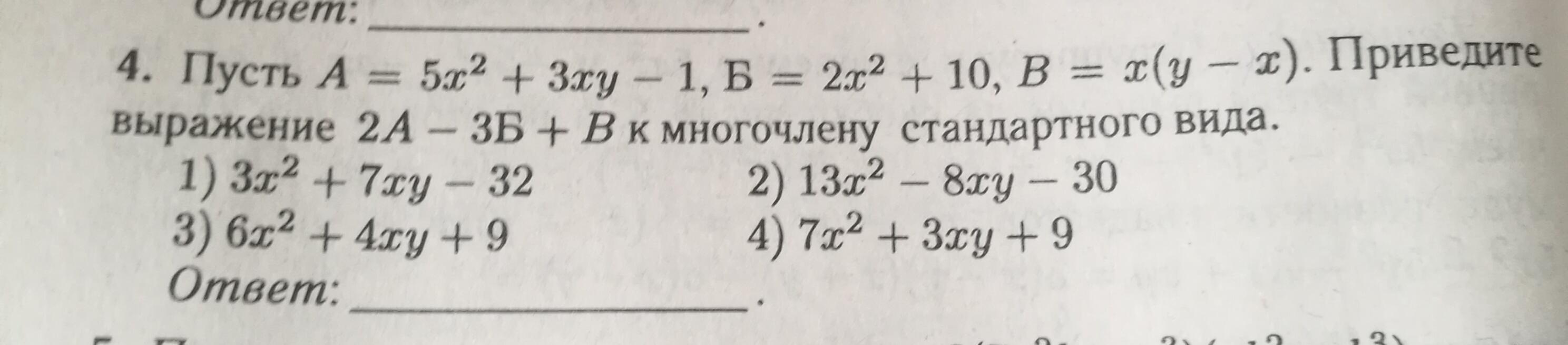 При А=5х²+3xy-1; Б=2х²+10; В=х(у-х)