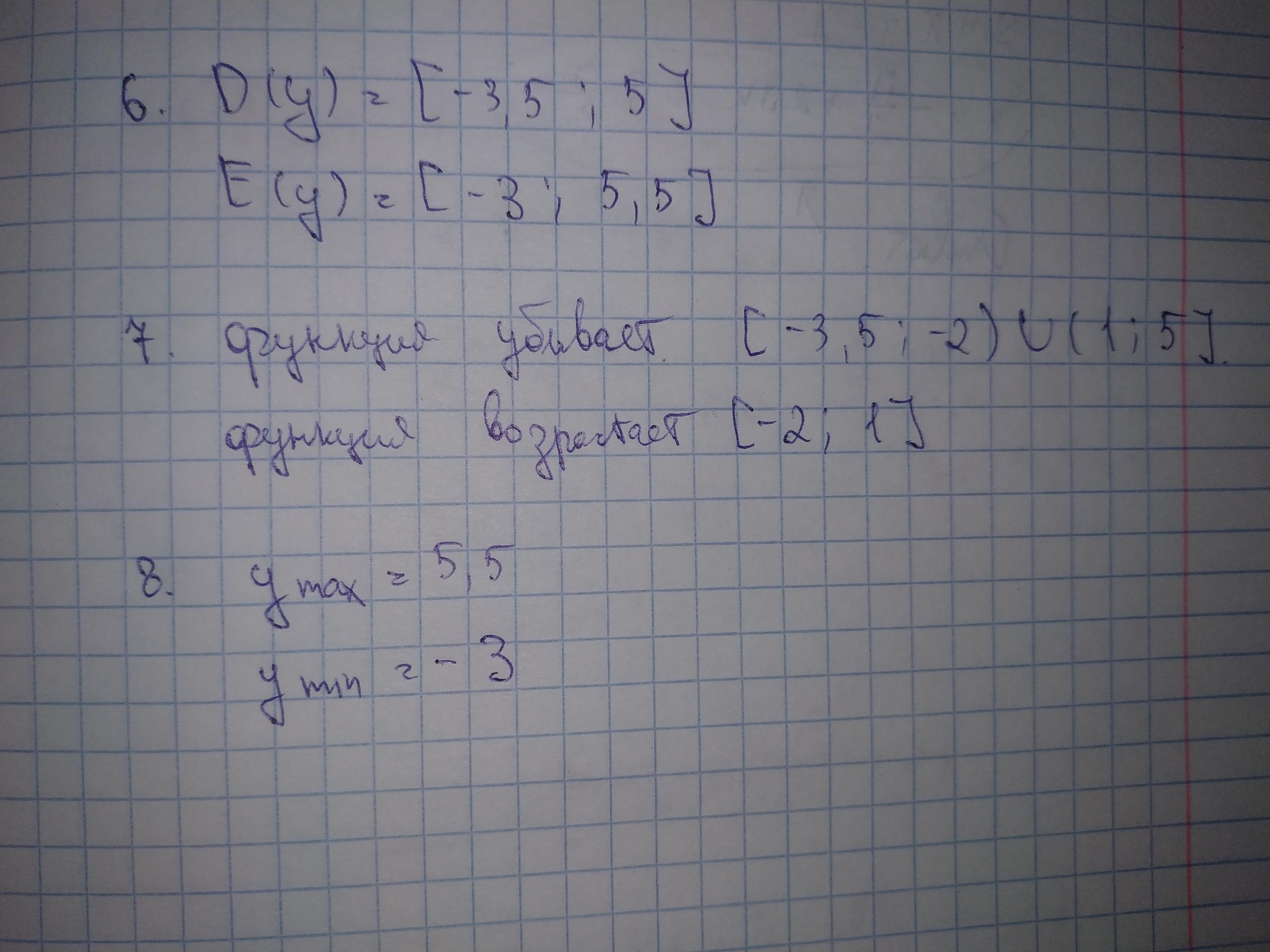 6. Область определения функции: D(y)=[-3.5;5]. Множество значений функции: E(y) = [-3;5.5].
