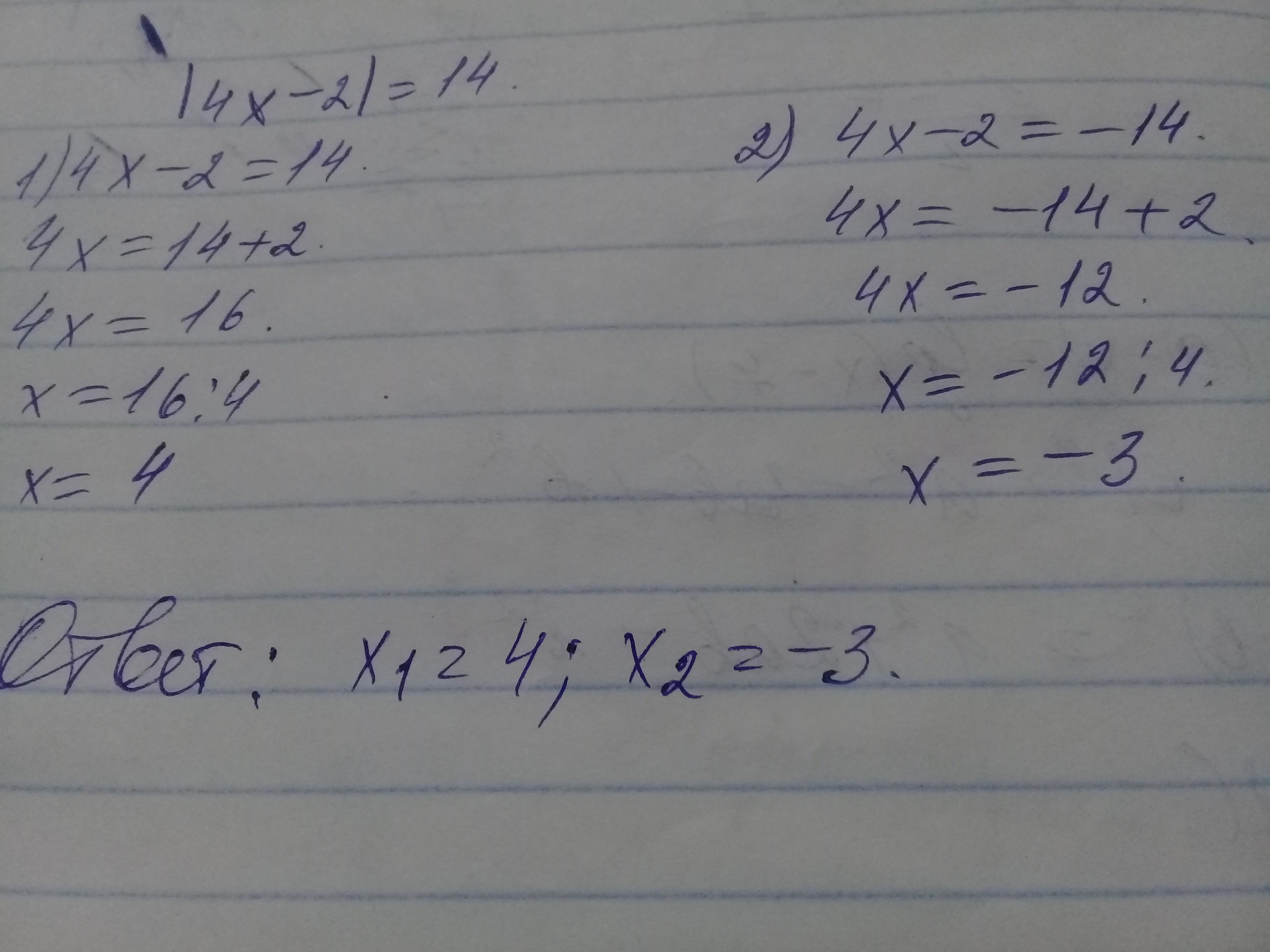 4x - 2 = 14 или 4x - 2 = -14