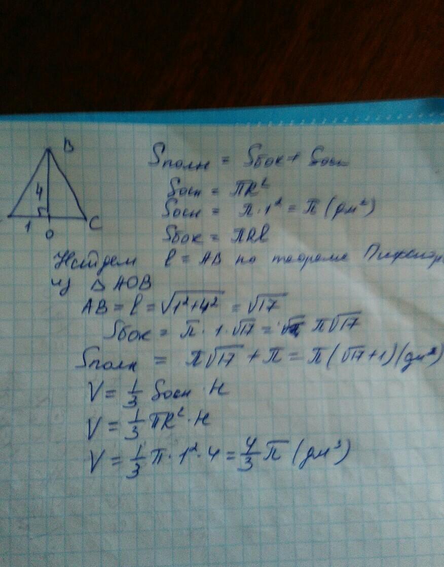 Радиус основания конуса равен 1 дм,высота равна 4дм.Найдите площадь полной поверхности и объем конуса