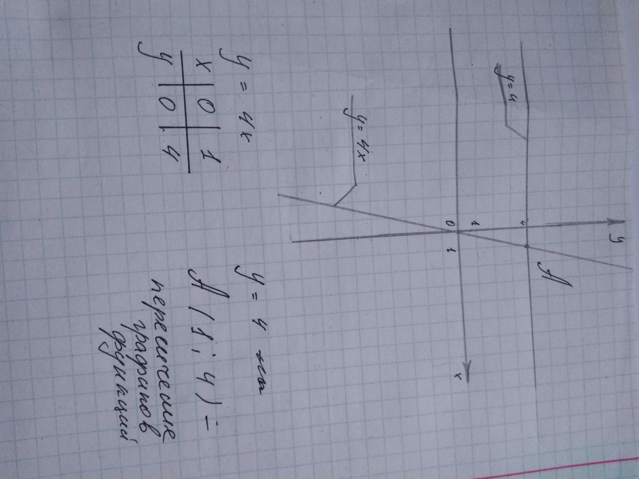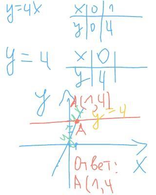 постройте в одной системе координат графики линейных функций y=4x и y=4.Найдите координаты точки пересечения графиков этих функций.