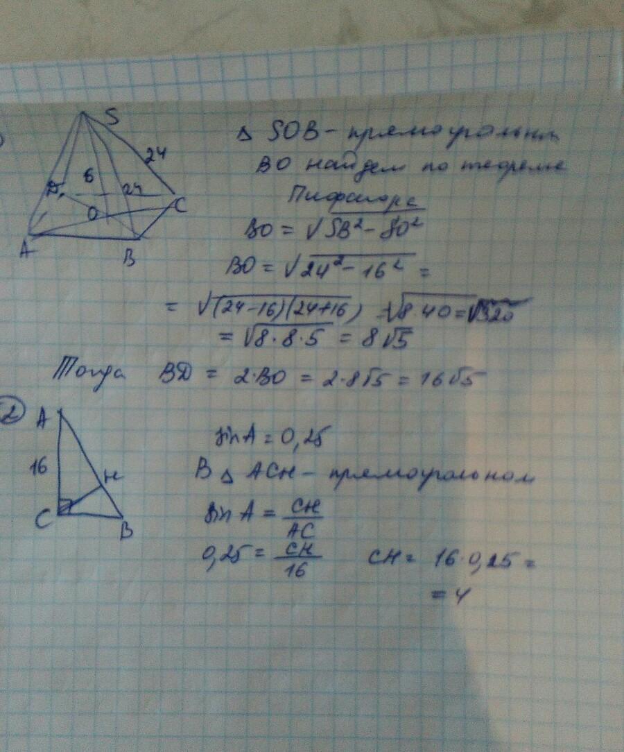 1. В правильной четырёхугольной пирамиде SABCD точка О-центр основания, S-вершина, SO=16. SB=24. Найдите длину BD.