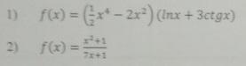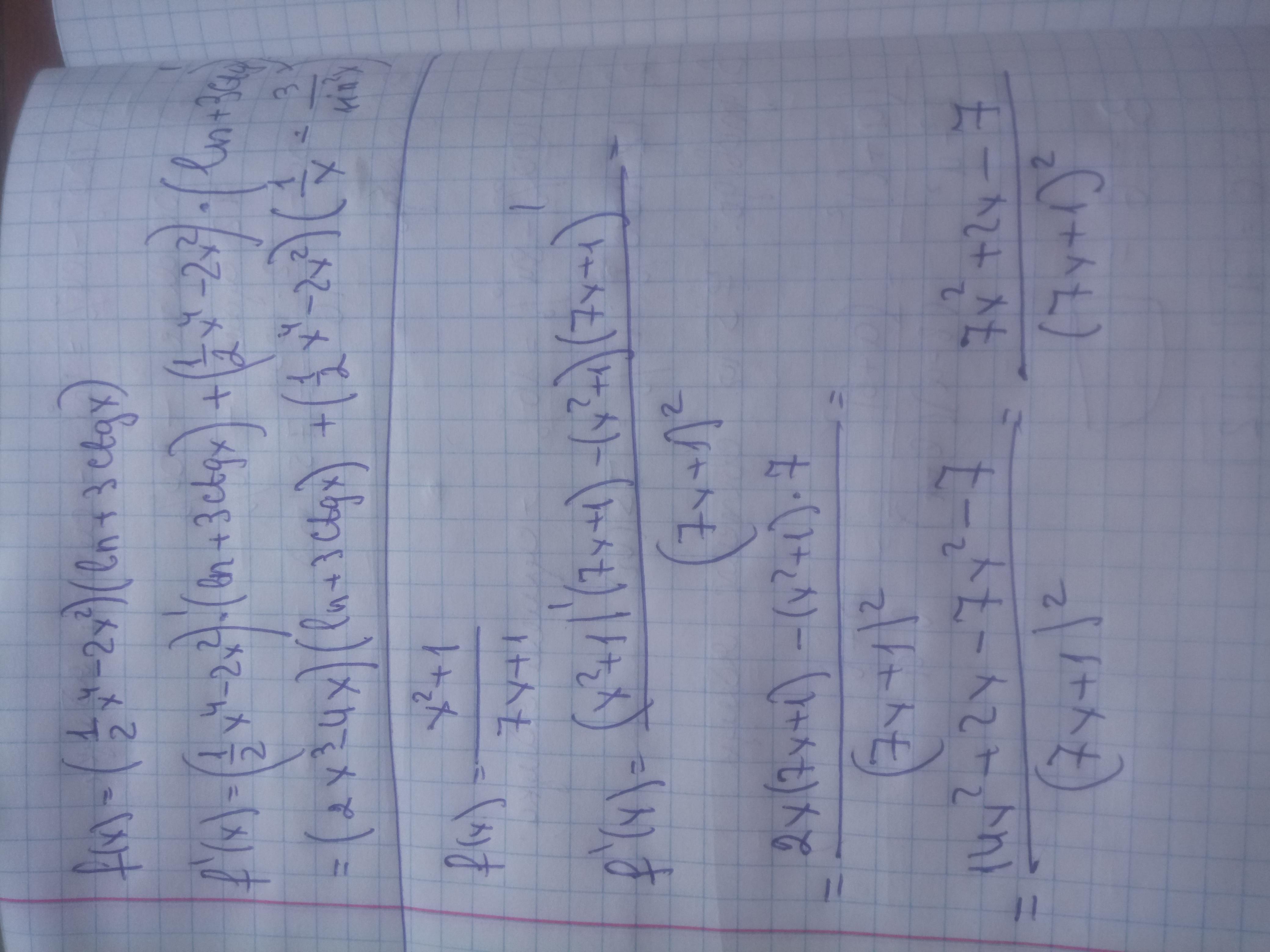 1. f'(x)=(0.5x⁴-2x²)(㏑x+3ctgx)'=(4*0.5*x³-4x)*(㏑x+3ctgx)+(0.5x⁴-2x²)(1/x-3/sin²x)=