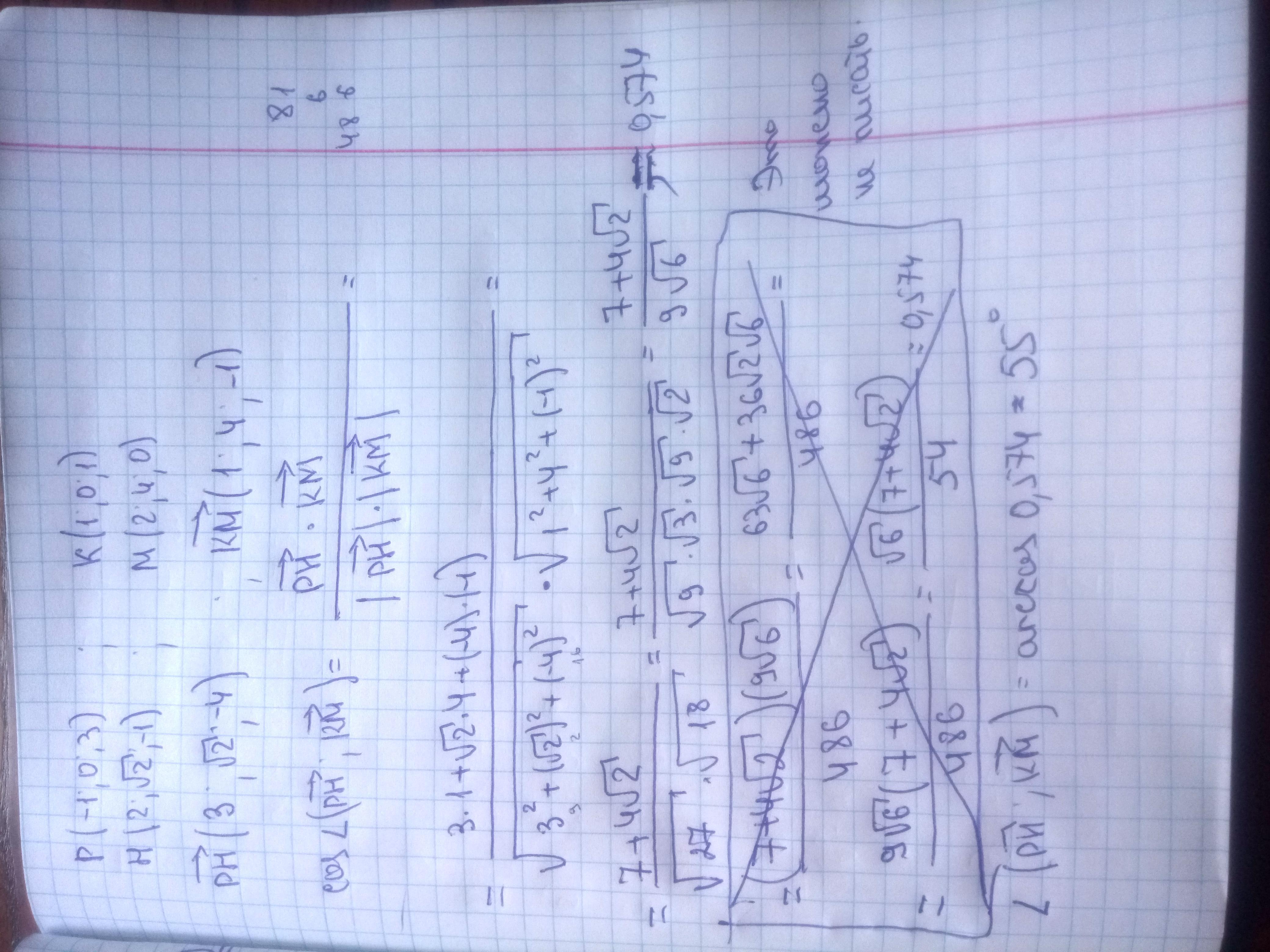 . Даны точки P(-1;0;3), H(2;√2;-1), К(1;0;1), M (2;4;0). Найдите угол между векторами РН⃗ и КМ⃗
