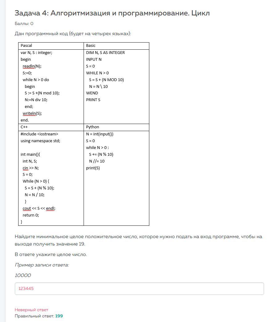 Итак, нам нужно найти теперь просто минимальное число, сумма составных чисел которого дает 19. Это число 199, как и написано у вас.