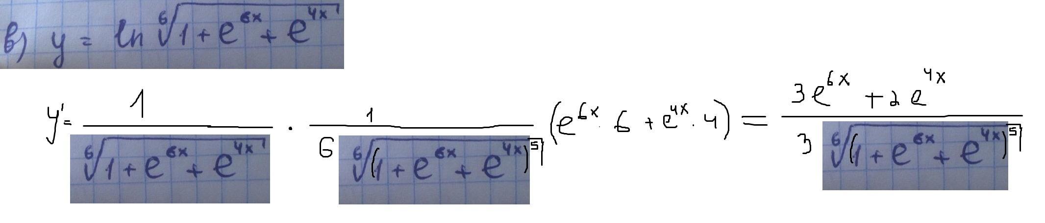 у'=(㏑(1+e⁶ˣ+e⁴ˣ)¹/⁶)'=1/((1+e⁶ˣ+e⁴ˣ)¹/⁶)*(1/(6)*1+e⁶ˣ+e⁴ˣ)⁻⁵/⁶)*(6e⁶ˣ+4e⁴ˣ)=