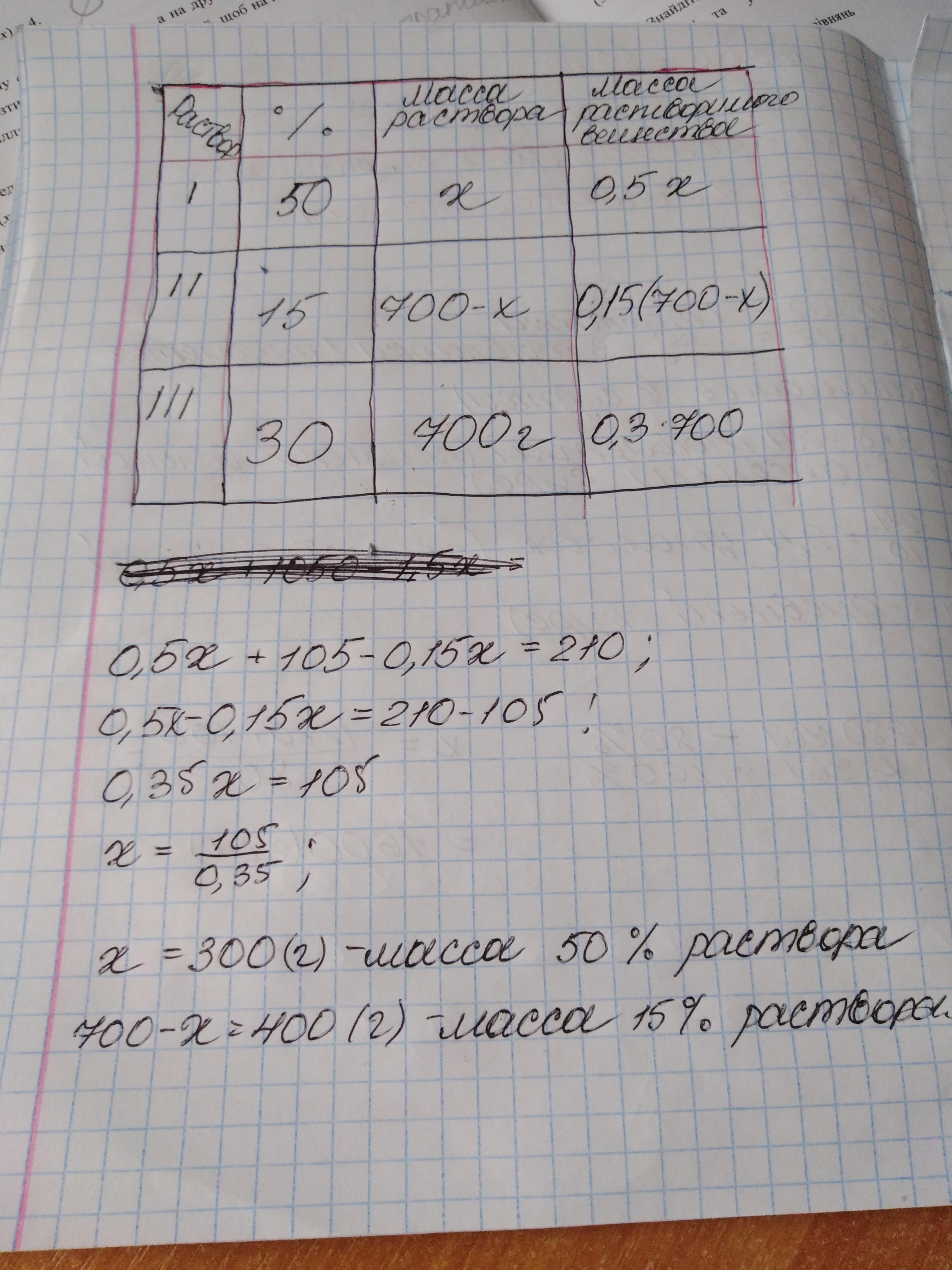 Для приготовления 700г 30%-ного раствора необходимо взять 50% и 15%-ные растворы с массами соответственно.