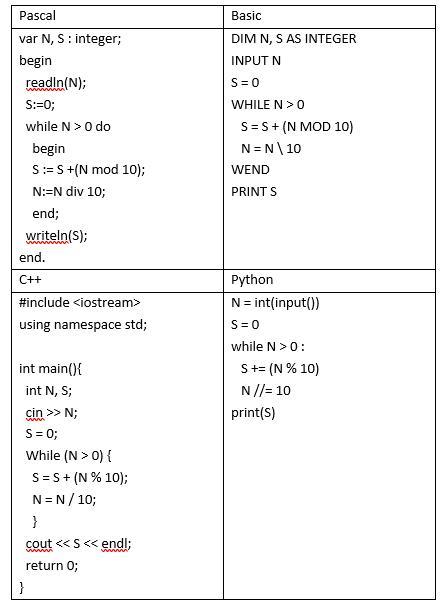 Переменная S должна на выходе программы быть равной 19, в результате работы этой программы S равна сумме цифр из которых состоит входное число N, число 19 можно представить как сумму состоящую не менее чем из трёх одноразрядных слагаемых, то есть N это трёхзначное число, легко понять что N =199, это наименьшее число, сумма цифр которого равна 29.