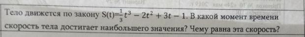 t³-2t²+3t-1 . В какой момент времени скорость тела достигнет наибольшего значения? Чему равна эта скорость? Математика 10-11 класс