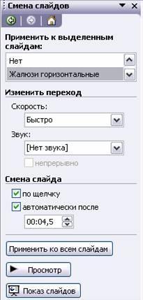Установленный флажок по щелчку разрешает смену слайда щелчком мыши до истечения установленного срока демонстрации. Если флажок установлен просто по щелчку мыши, то в этом случае время показа не определено.