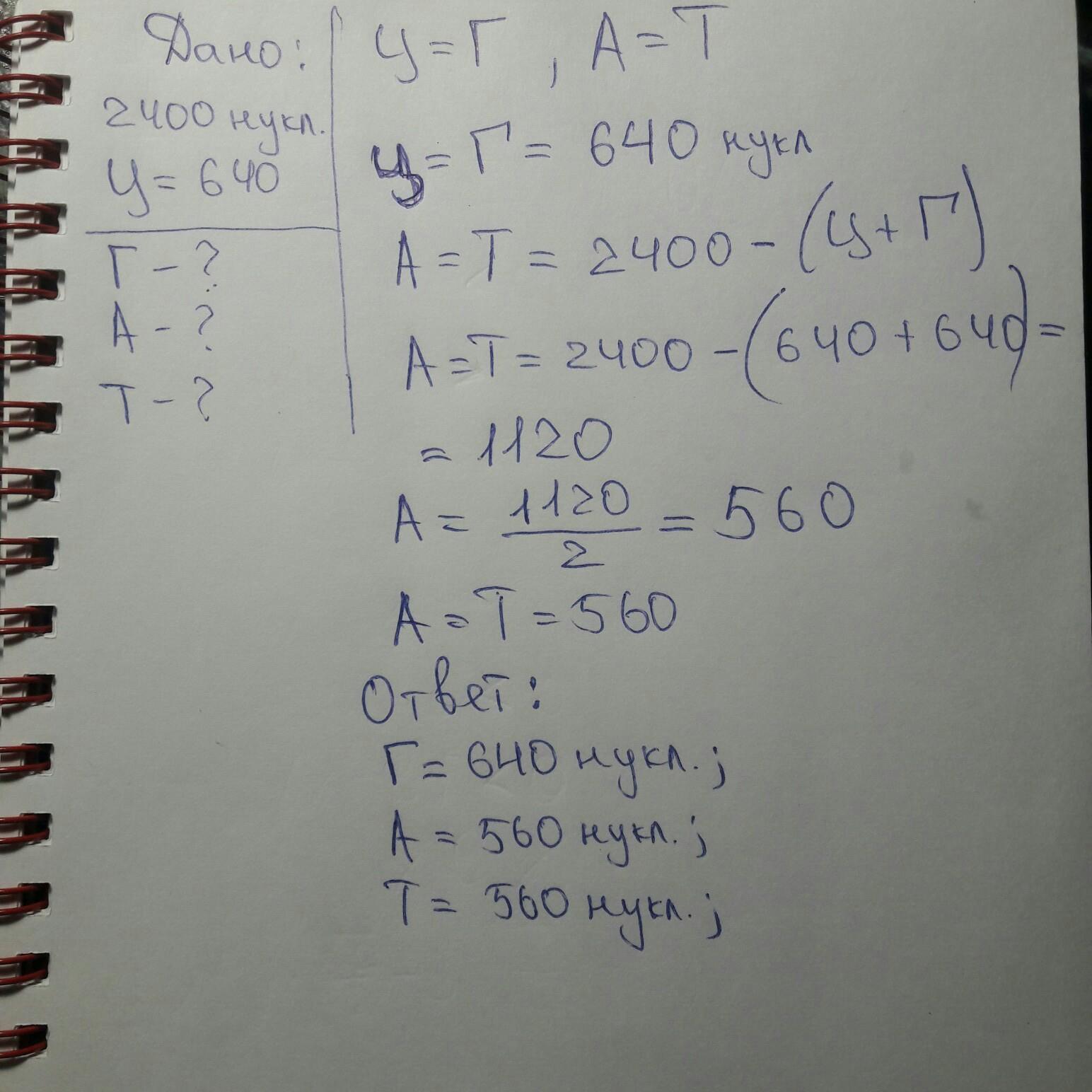 фрагмент молекул днк содержит 2400 нуклеотидов на долю цитозиновых приходиться 640 Сколько содержится других нуклеотидов в молекуле ?