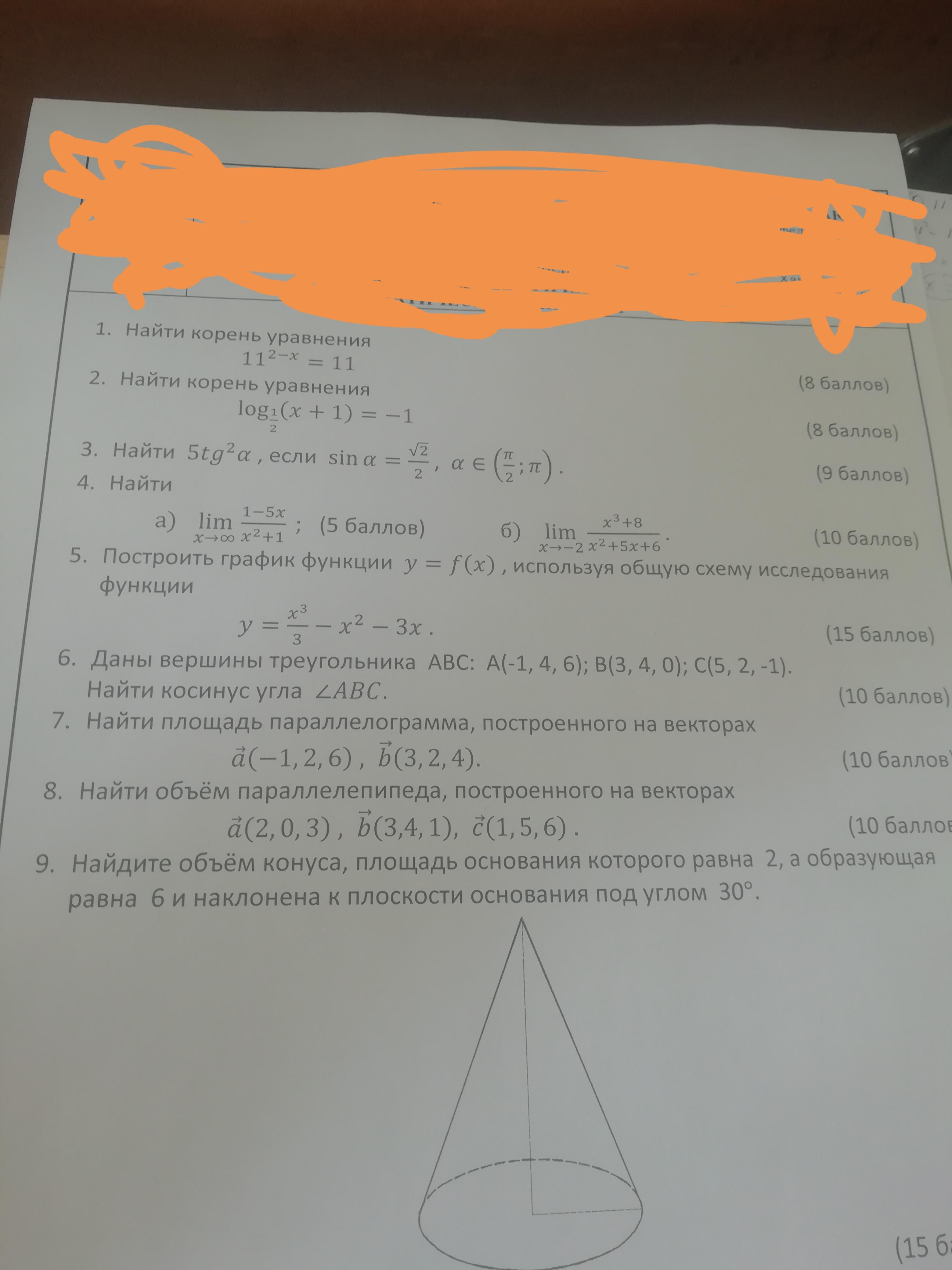 9)V=1/3пr^2*H=1/3*2*H, высота конуса лежит против угла в 30 гр., значит Н=1/2*6=3 и тогда V=1/3*2*3=2