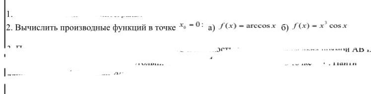 a) f(x) = arccos x\f'(x) = -frac{1}{sqrt{1-x^2}}\f'(0) = -frac{1}{sqrt{1-0^2}} = -frac{1}{sqrt{1-0}} = -frac{1}{sqrt{1}} = -frac{1}{1} = -1\\b) f(x)=x^3cos x\f'(x) = (x^3)' cos x + x^3 (-sin x) = 3x^2 cos x -x^3sin x\f'(0) = 3cdot0^2 cos 0 -0^3sin 0 = 3cdot 0 cos 0 - 0sin 0= 0