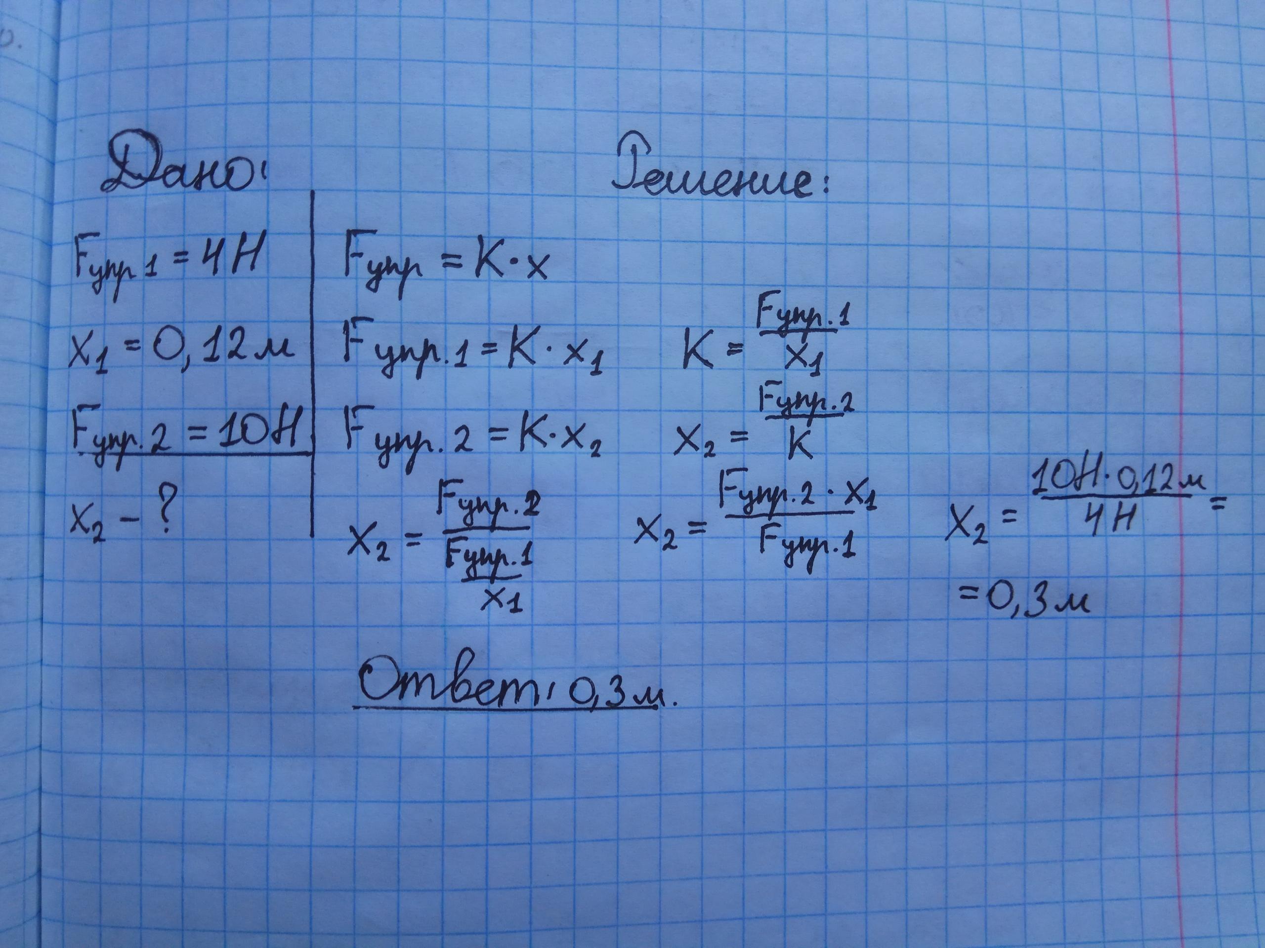 При открывании двери длина дверной пружины увеличилась на 0,12 м; сила упругости пружины составила при этом 4Н. При каком удлинении пружины сила упругости равна 10 Н. Оформите и распешите как в обычной задаче.