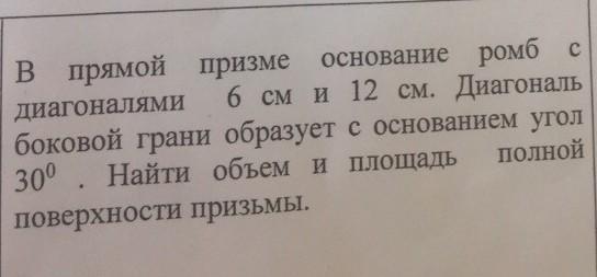 √(9+36)=3√5, ∠СВ₁С₁=30°. т.к. В₁С₁- проекция В₁С на плоскость основания. Тогда высота призмы СС₁=В₁С₁**tg30°=