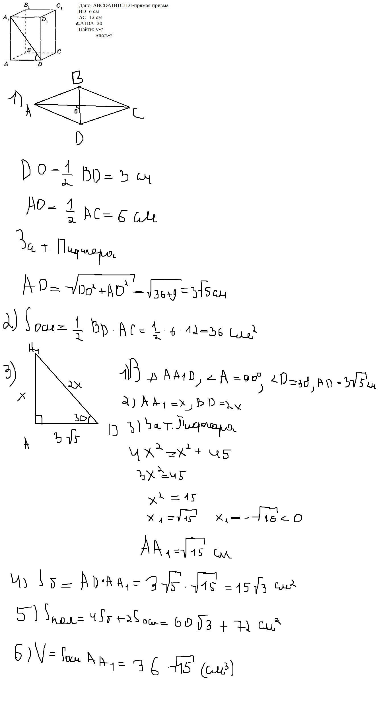 А₁В₁С₁Д₁ -ромб, площадь которого равна А₁С₁*В₁Д₁/2=6*12/2=36/cм²/. Зная половины диагоналей 6/2 и 12/2, можно найти сторону, т.к. диагонали пересекаются под прямым углом. значит. сторона равна √(3²+6²)=