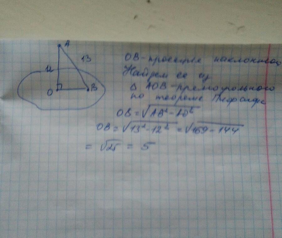 Из точки А, отстоящей от плоскости на расстоянии 12 см , проведена к этой плоскости наклонная АВ, равная 13 см. Найти проекцию АВ на данную плоскость.