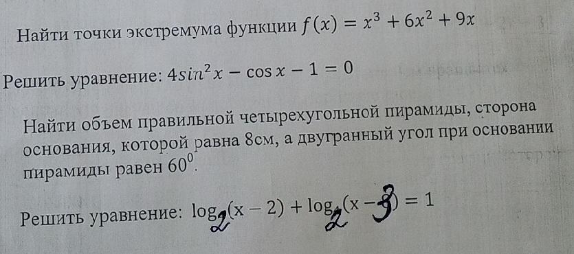 2)4sin^2x-cosx-1=0, 4(1-cos^2x)-cosx-1=0, 4-4cos^2x-cosx-1=0, 4cos^2x+cosx-3=0, cosx=-1, cosx=3/4, x=п+2пк, х=+- arccos3/4+2пк, к E Z