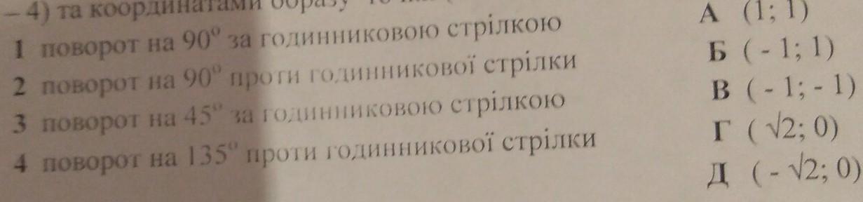 ПОМОГИТЕ!!!!!!!!!! дано точку A(0;корень2 ) установите соответствие между поворотами вокруг начала координат (1-4) и координатами образа точки(А-Д)