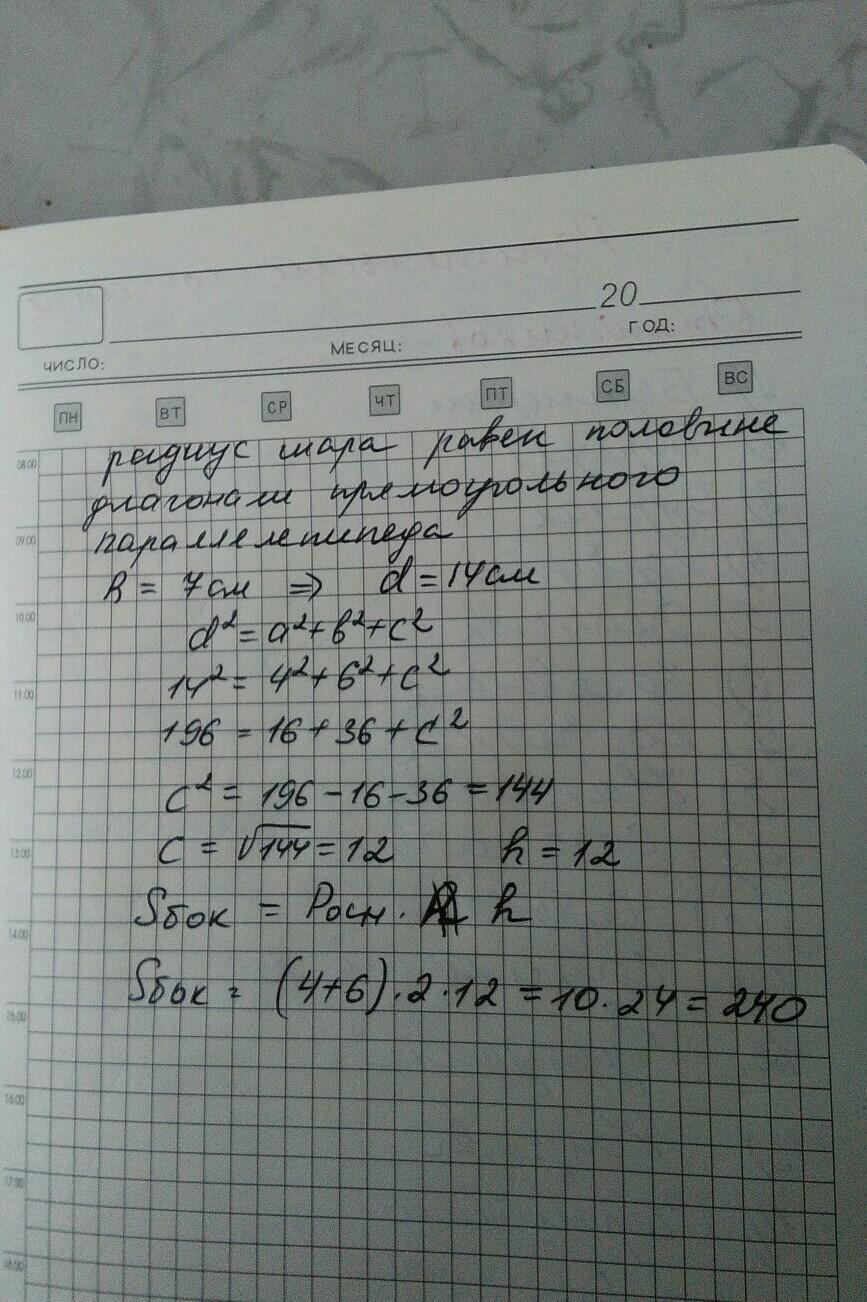 в шар радиуса 7 см вписан прямоугольный параллелепипед стороны основания равны 4 и 6 см найдите площадь боковой поверхности параллелепипеда