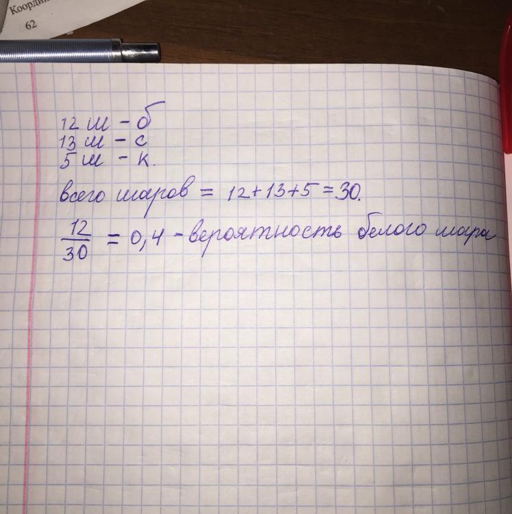 В урне имеется 12 шаров белого цвета, 13 шаров синего цвета, 5 шаров красного цвета. Вынимают наугад один шар. Найдите вероятность того, что этот шар окажется белым.