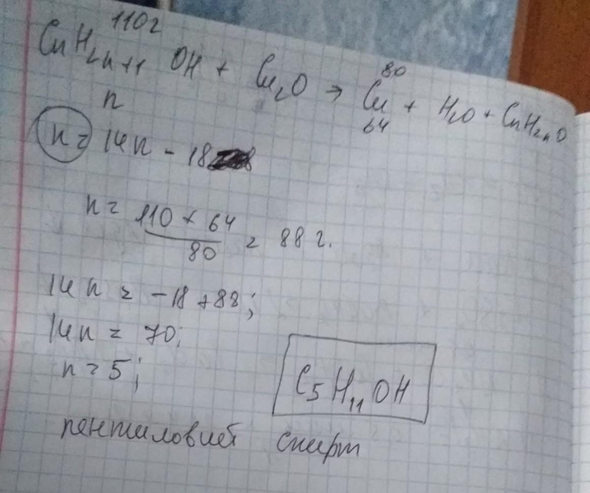 Внаслідок окиснення насиченого одноатомного спирту масою 110 г з купрум(2)оксидом, відновилася мідь, масою 80 г. Який спирт окиснили?