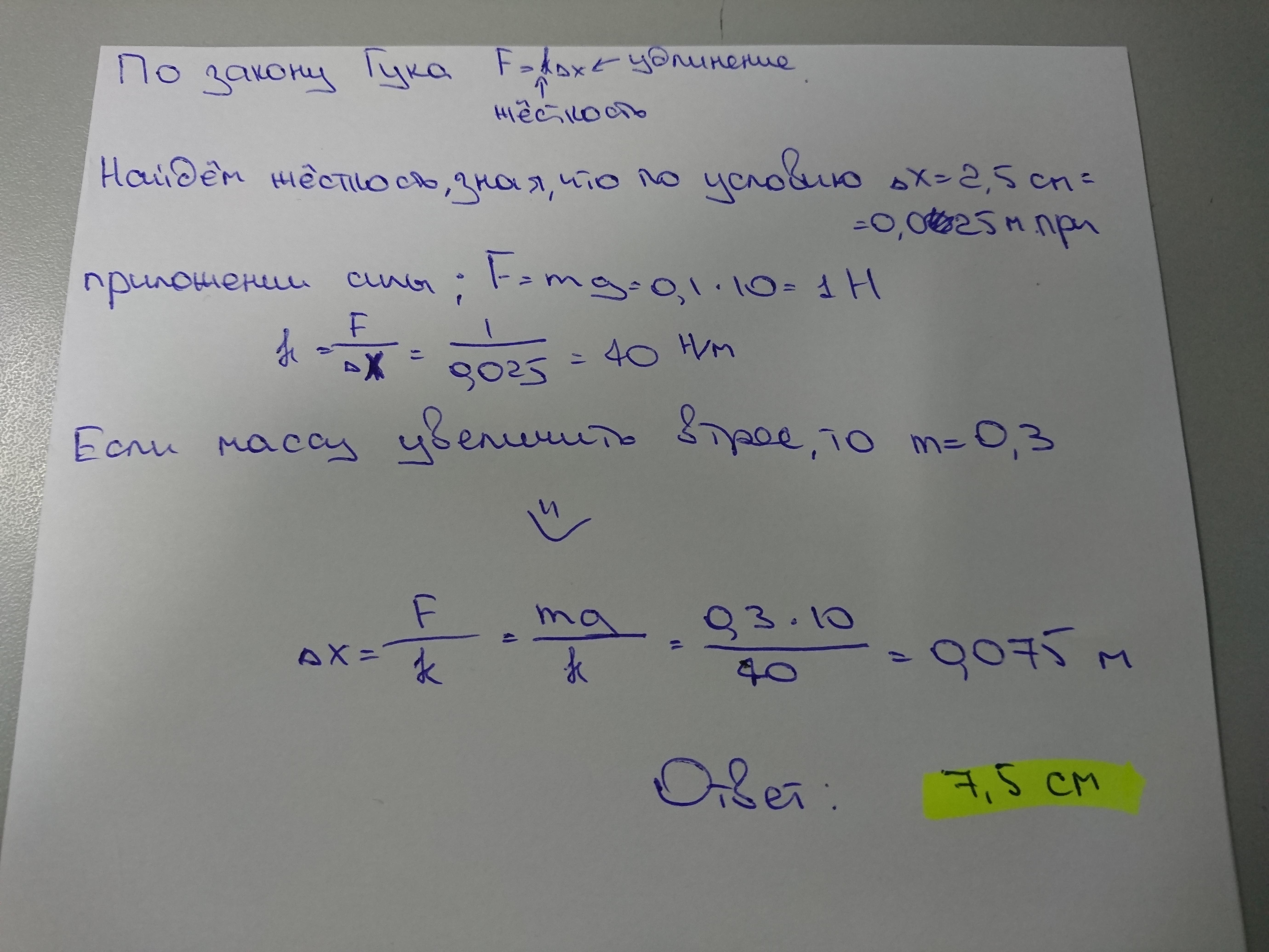 На штативе закреплён школьный динанометр. К нему подвесили груз массой 0.1 кг. Пружина динанометра при этом удлинилась на 2,5. Чему будет равно удлинение пружины, если масса груза увеличится втрое?