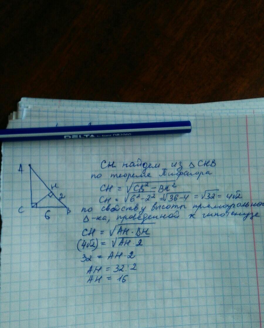 Дано: ΔАВС - прямокутний, ∠С=90°, АС=6 см, АД=2 см. Знайти ВД.