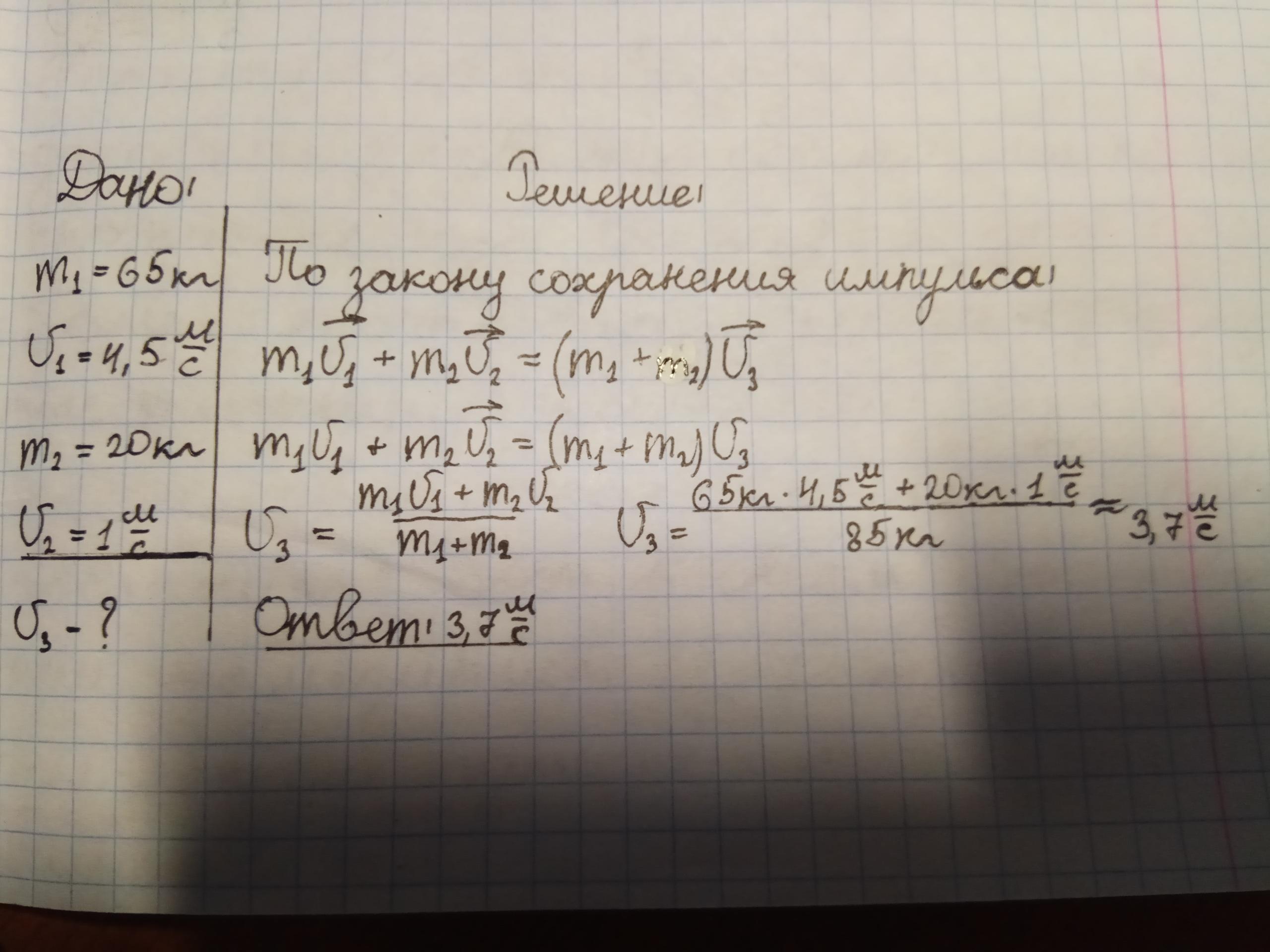 3. Человек массой 65 кг, бегущий со скоростью 4,5 м/с, догоняет тележку массой 20 кг, движущуюся со скоростью 1 м/с, и вскакивает на неё. С какой скоростью станет двигаться тележка с человеком после этого? Ответ дать в СИ.