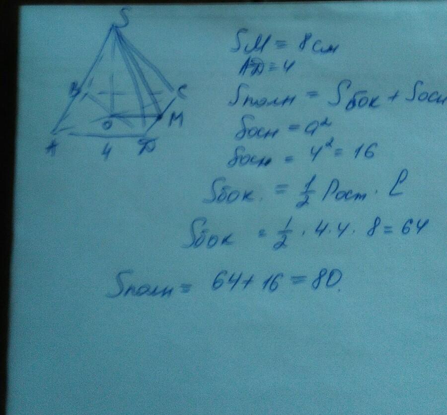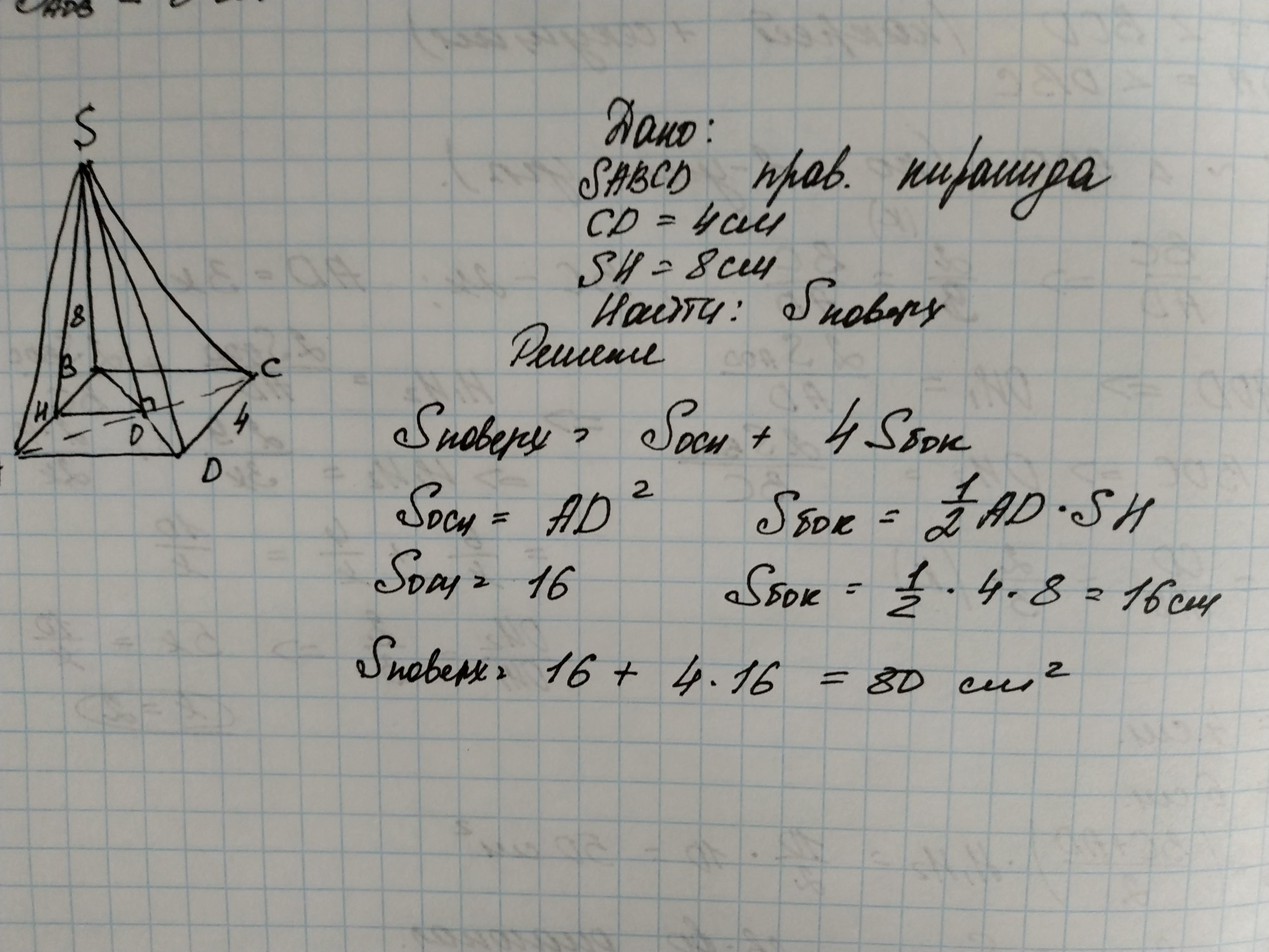 правильная четырехугольная пирамида сторона основания 4 см высота боковой грани 8см чему равна ее полнаяповерхность