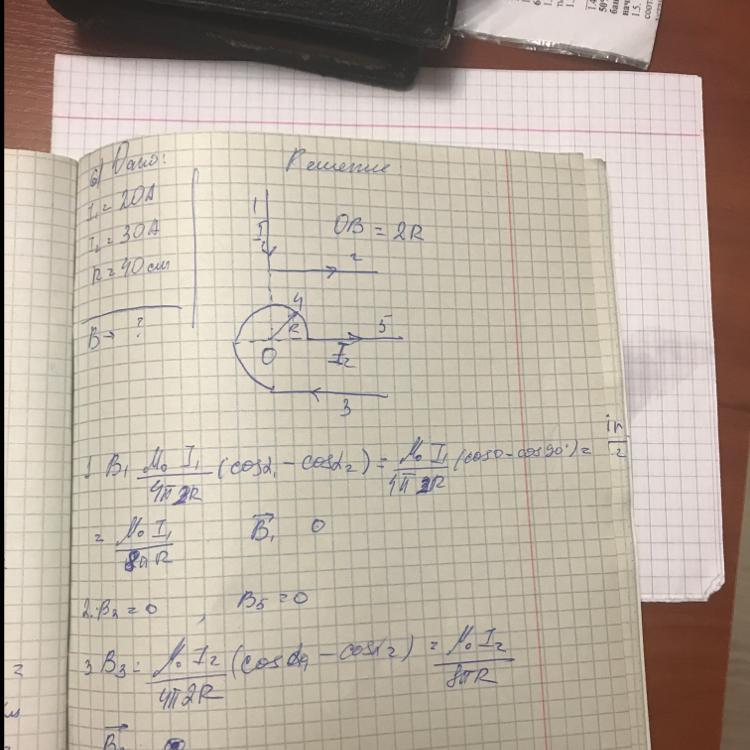 В плоскости расположены два бесконечных контура из тонкого провода. Контурные токи I1=20, I2=30, R= 40 см. Определить модуль и направление магнитной индукции B, создаваемое этими токами в точке О.