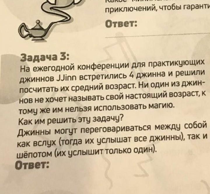 Третий джинн делает то же самое: прибавляет к сумме, которую назвал второй, свой истинный возраст, сообщает сумму четвёртому.