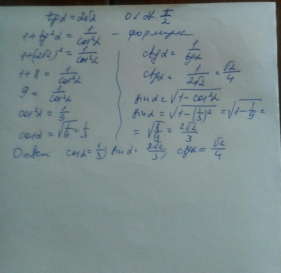 Вычислить значение каждой из тригонометрических функций если tg a=2√2, 0<1<Π^2