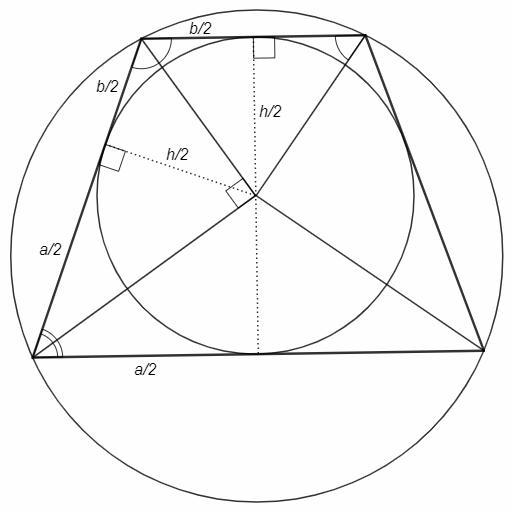 Трапеция с основаниями а и b вписана в окружность и описана около окружности. Найдите ее высоту?