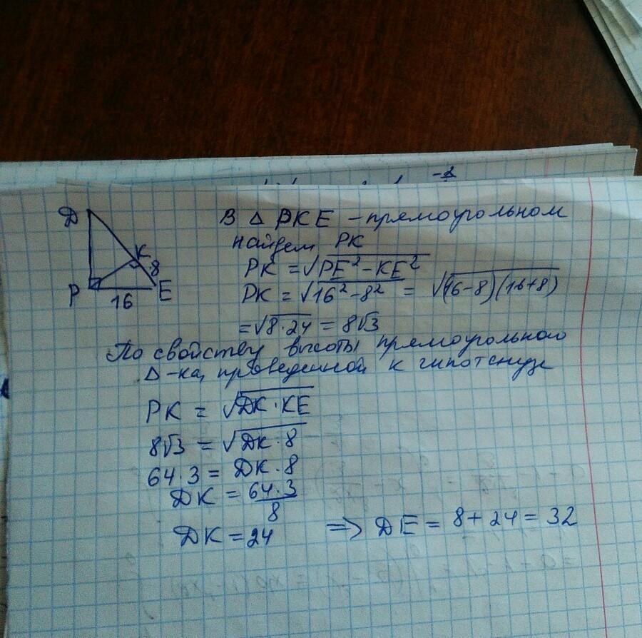 дите гипотенузу DE, если PE =16 см,