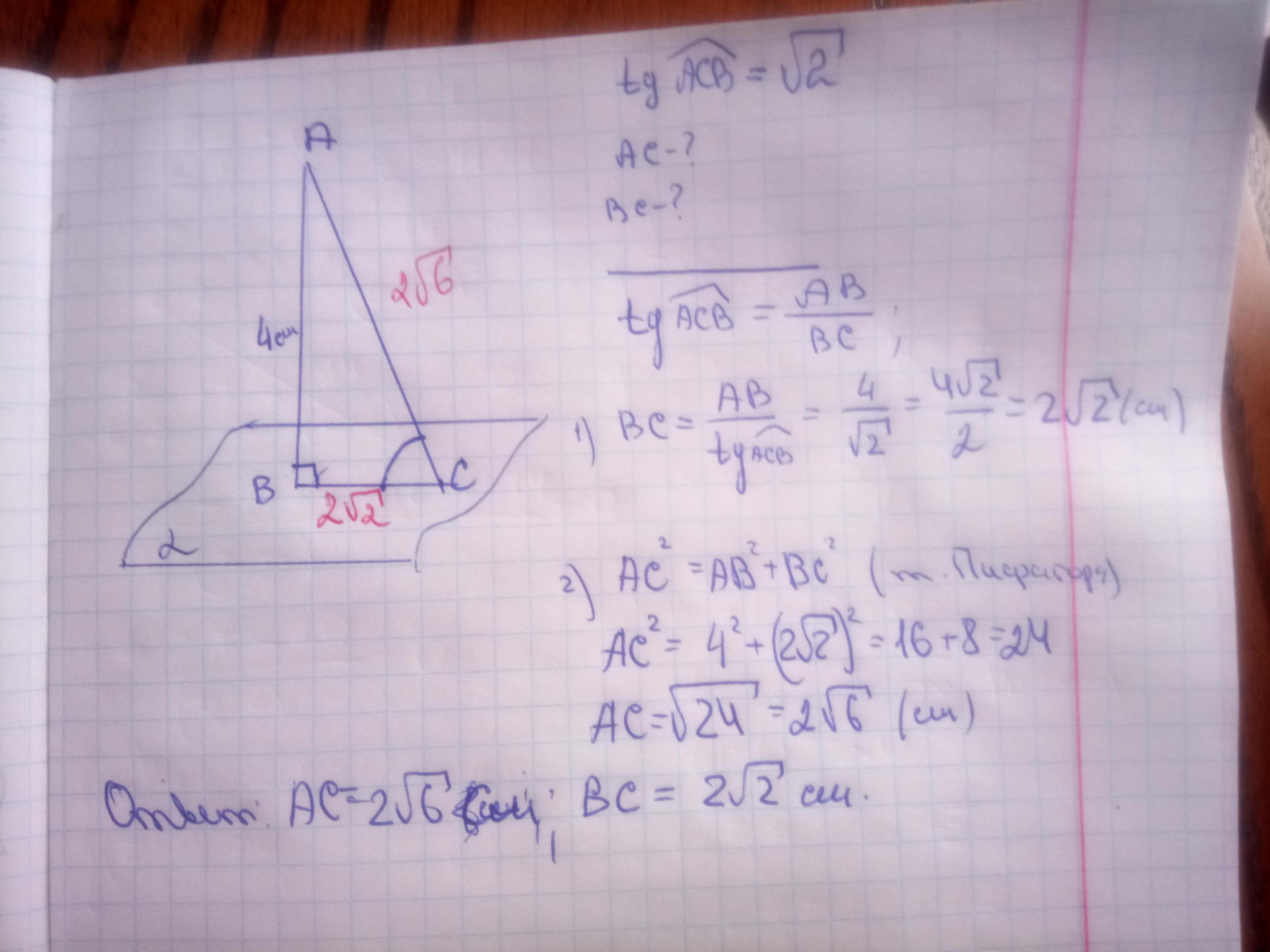 Из точки А к плоскости альфа, проведена наклонная АС и перпендикуляр АВ, равный 4см. Найдите наклонную и её проекцию, если tg ACB = корень из 2ух