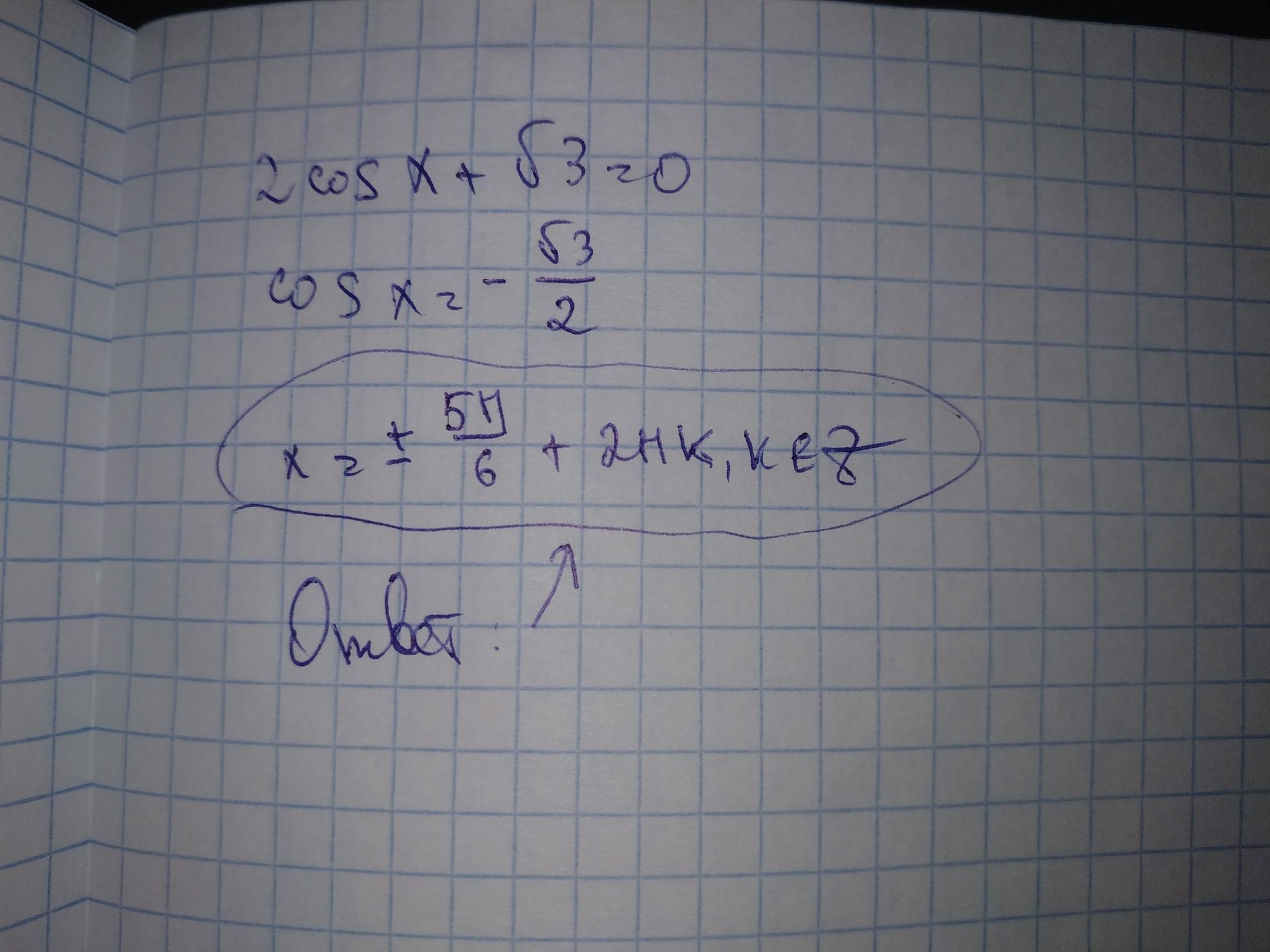 2cosx+V3=0, cosx=-V3/2, x=+- 5п/6+2пк, где к E Z.