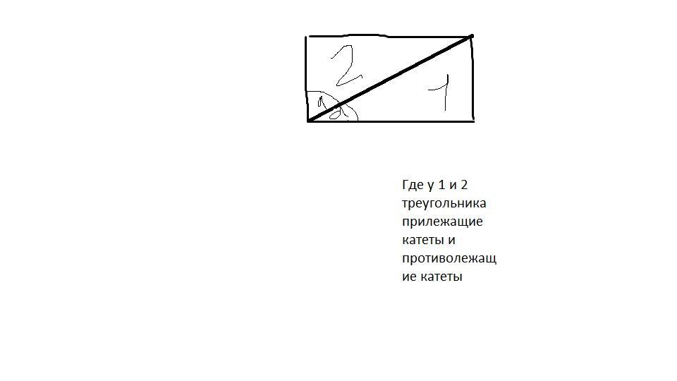 как-то так. Стороны, прилегающие к прямому углу, называются катетами. Сторона a может быть идентифицирована как прилежащая к углу В и противолежащая углу A, а сторона b — как прилежащая к углу A и противолежащая углу В.