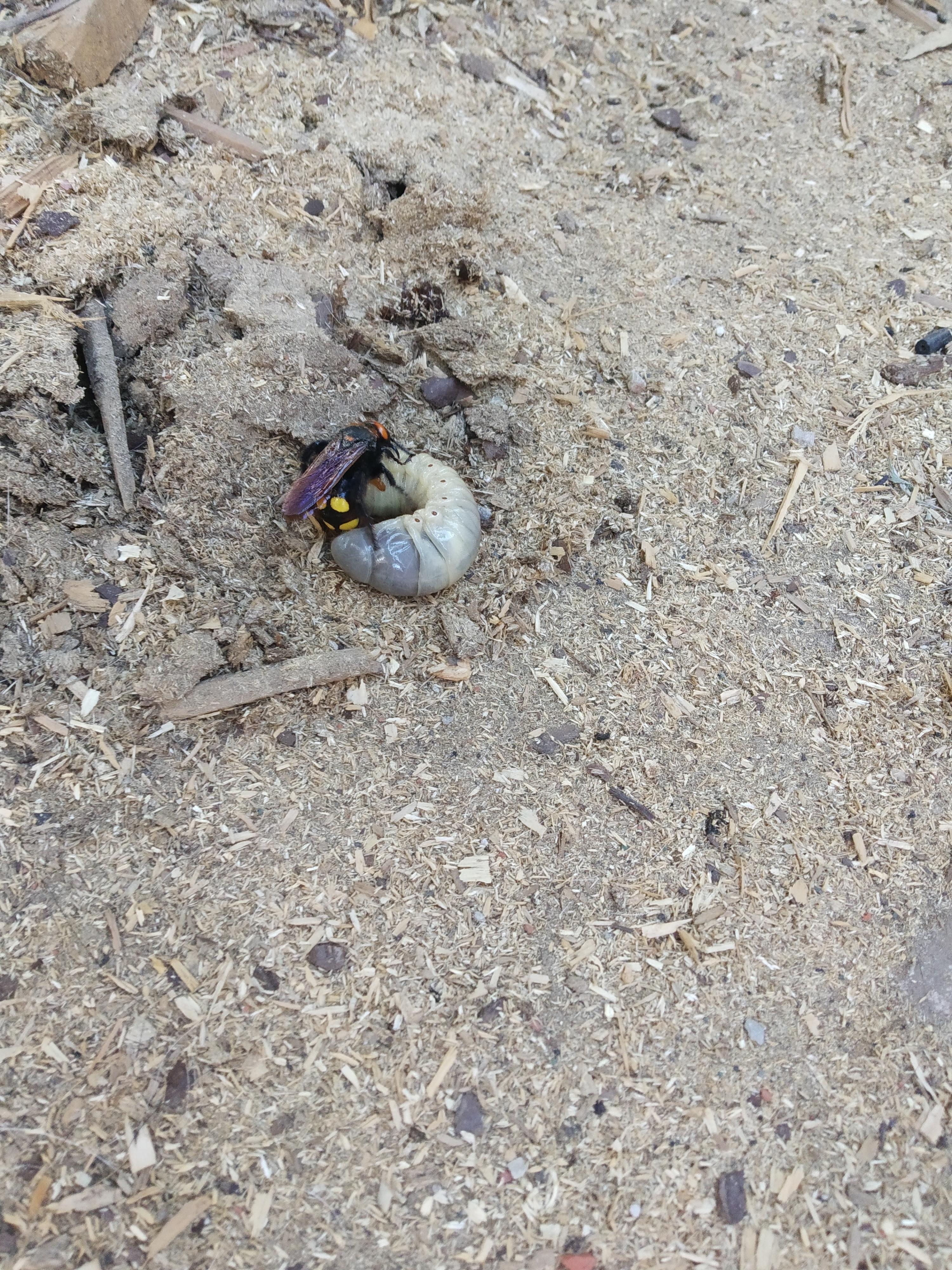 А оса - сколия; парализует личинку и откладывает на нее яйца - личинки сколии потом питаются этой личинкой